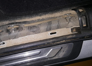 세 번째 방법. 차량 하부 프레임 틈을 확인하는 방법입니다. 문틈에 있는 고무패킹을 쭈욱 아래쪽까지 벗겨내면 작은 틈을 확인할 수 있습니다. (뜯어본다고 아무도 뭐라고 하지 않습니다. 당당한 판매자라면 얼마든지 확인하라고 합니다.) 침수차인 경우 틈 사이로 진흙, 흙탕물 자국 등이 보이며 이 부분이 지저분할 경우 마찬가지로 구매 목록에서 제외하셔야 합니다.